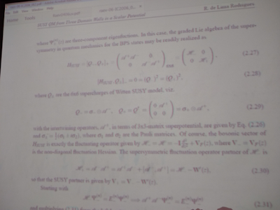 Em seguida, o professor Rafael apresentou um trabalho sobre 3 campos reais acoplados, desenvolvidos em parceria com os professores Aércio Lima (diretor do IQUANTA da UFCG, campus Campina Grande), professores Eugênio Bezerra e Valdir Barbosa (ambos da UFPB). Neste trabalho, é investigado a teoria de campos supersimétrica, cujo modelo matemático é baseado em um supercampo descrito por ambos campos bosônico e fermiônico. A supersimetria em mecânica quântica é aplicada para a equação de estabilidade de 3 paredes de domínios associada a campos reais acoplados.